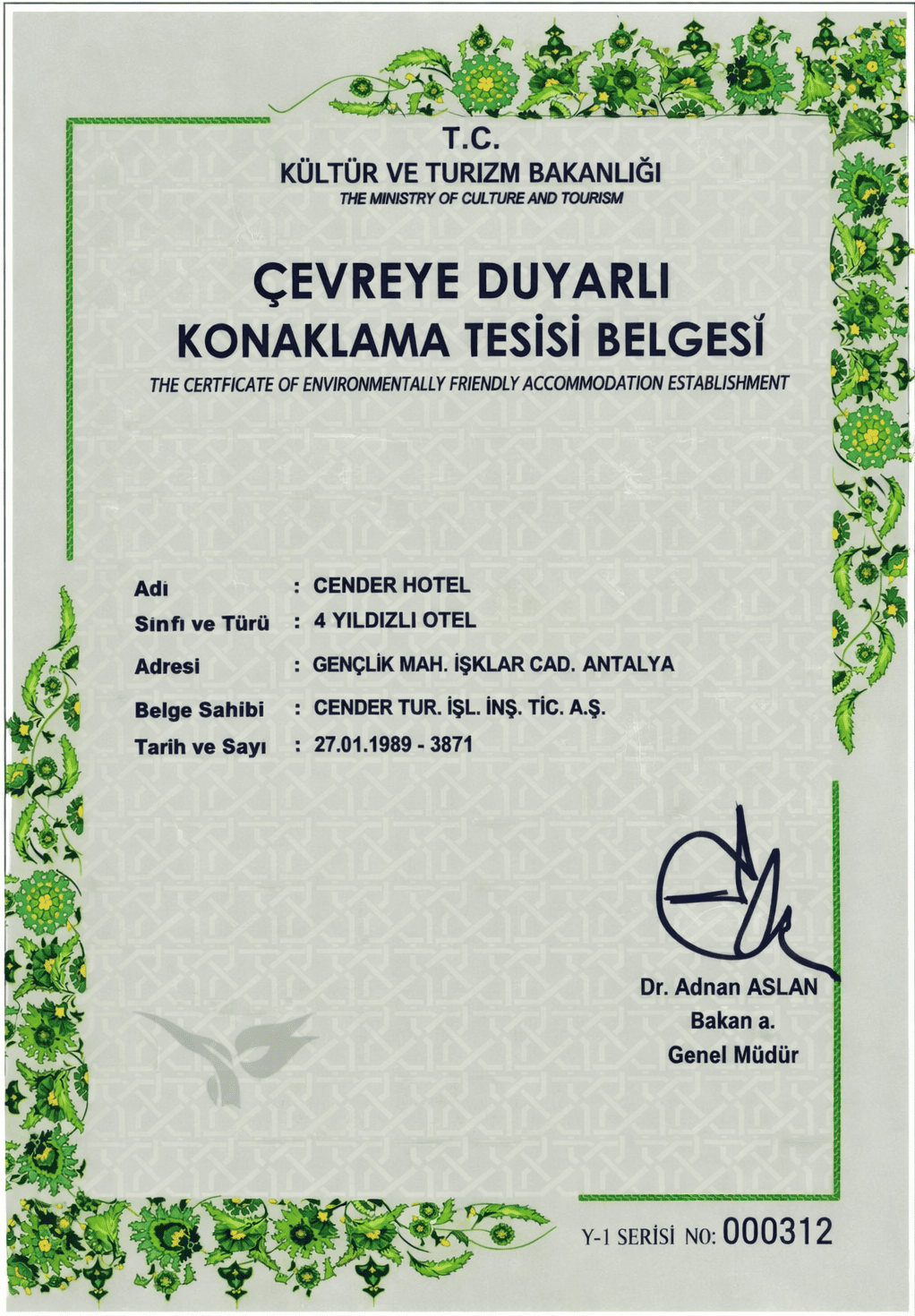 Cender Hotel olarak, doğaya ve çevreye duyarlı bir işletme anlayışını benimsiyoruz. Bu belge, sürdürülebilir turizm ilkelerine bağlılığımızı ve çevreye saygılı hizmet yaklaşımımızı resmileştirmektedir.